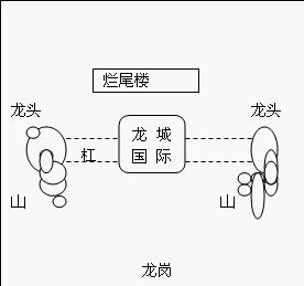 龙城国际在“杠”的半山处,为最好,太高了,就成为孤峰独立,为不好,易经有云“孤阴不生,独阳不长,双阳死”。正好在杠的顶峰有一座规模很大的烂尾楼,据说政府也有股份投入,但因资金不足不能建立起来。