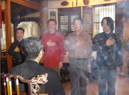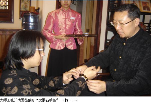 下午大约四点,仪式开始了,首先,由蔡易升大师携弟子们共同敬香参拜“伏羲、周文王、孔子、鬼谷子”四位先祖,从他们的装束和仪态上足以得见对先人的敬重、缅怀之情;之后,见蔡易升大师正襟危坐在供桌前的太师椅上,静静聆听新入门弟子们一一诵读源自弟子心声的“拜师书”,略显哽咽的音量,可见弟子激动、赤诚之至;随后,新弟子们共同向大师作“弟子宣言”:“……谨遵恩师教诲,视易学一道为做人之道,尊师重友,礼让谦恭,团结同道,刻苦用功,以求日学有所悟,登堂渐入室……”,铿锵的誓言响彻厅堂,看着弟子们认真、严肃的宣誓,我想,此时的蔡易升大师应该更觉欣慰——倾毕生精力研究易学,独创招招致敌的《易升心经》,在业内享有盛誉,而今,又喜添高徒,后继有德人源远流长……最后,新弟子分别向大师敬茶、叩拜,同时,蔡易升大师回礼“虎眼石手链”,并亲手给爱徒戴上,从大师和蔼可亲的慈祥目光与弟子仰慕、崇拜的眼神交汇中,让众人感受最深的应该是羡慕、嫉妒……