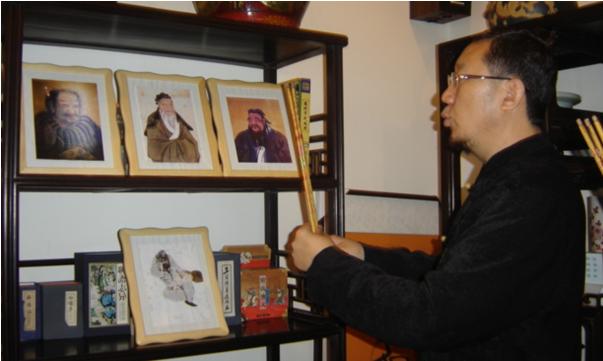 还别说,整个厅堂古朴典雅,全部是纯木质精雕古家具装备,我也分不清是哪个朝代的,桌桌、椅椅、笔、墨、砚、架、琳琅满目,仿佛到了古文物博物馆,周围陪衬亭阁、游鱼戏水、及大型根雕茶几、坐墩,又像到了“聚仙堂”,若不是看到厅堂正中的“拜师仪式”字幅和书架上刚刚摆好的“伏羲、周文王、孔子、鬼谷子”之像,差点忘了“正事”。